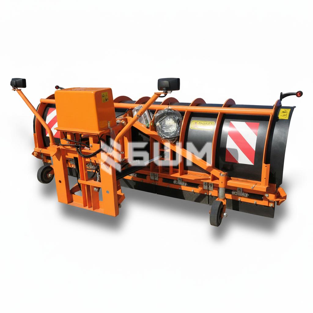 Standard equipment includes electro-hydraulic control with a floating position, which increases operating comfort and extends the service life of the equipment. Additionally, the snow plow can be equipped with steel blades, support wheels, signal flags, and a shock absorption system.